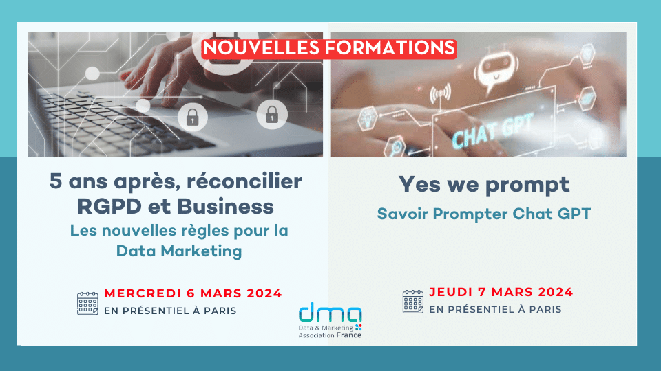Pour bien commencer l'année, la DMA Académie vous propose deux nouvelles formations pensées pour vous et vos collaborateurs : “Yes we prompt” pour apprendre à prompter ChatGPT et "5 ans après, réconcilier RGPD et Business : les nouvelles règles pour la data marketing"