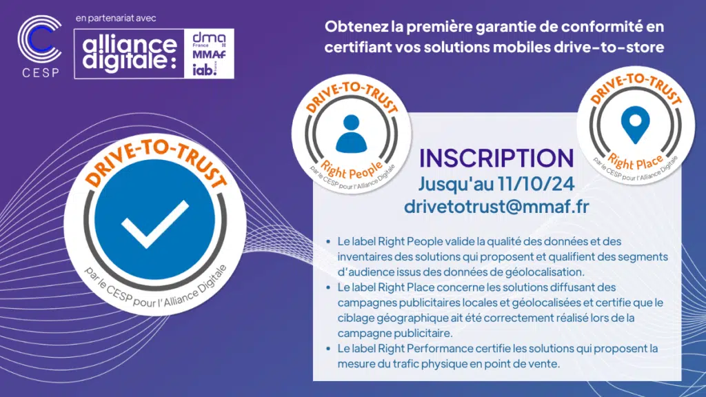 En souscrivant à Drive-to-Trust, les acteurs des solutions mobiles drive-to-store souhaitent garantir en toute transparence leur conformité aux engagements qu’ils prennent vis-à-vis de leurs clients. En parallèle des certifications Right People et Right Place, ils ont l’opportunité de souscrire à Right Performance, la certification de la mesure d’impact de la publicité mobile en magasin.