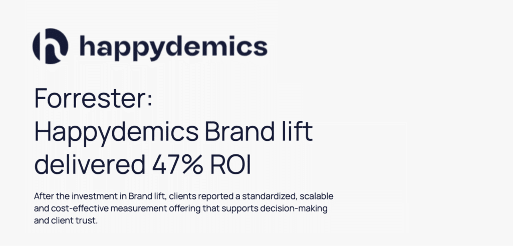 Une étude indépendante réalisée par Forrester Consulting, à la demande d'Happydemics, révèle que le Brand lift a permis d’atteindre un retour sur investissement de 47 % pour une organisation composite. L’analyse met également en avant un élargissement des investissements, notamment via l’upsell et la fidélisation, ainsi que des gains d’efficacité significatifs en matière de mesure.